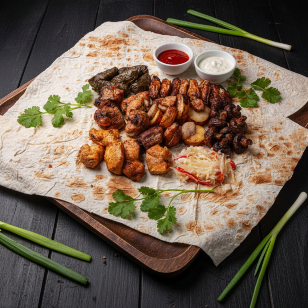 Филе кур., куриный на кости, крылья, долма, шампиньоны, картофель с салом, салат летний соус белый-3 соус красный-2 капуста,лук-2 лаваш-2 куска Сеты не проходят по акциям и промо-кодам. Баллы с сетов не списываются