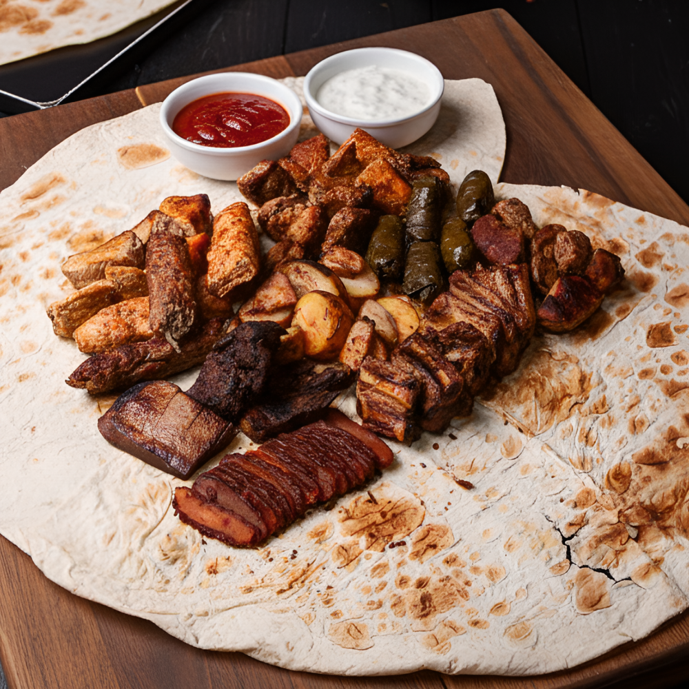 Шея, рёбра, язык говяжий, грудинка, долма ,карбонат, люля кур., люля свиной ,окорок , бастурма, картошка с салом