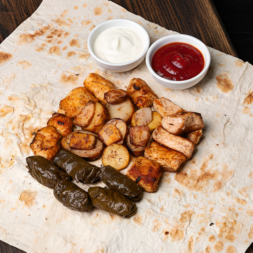 Карбонат, филе кур., картошка с салом, долма соус красный-2 соус белый-2 капуста,лук-2 лаваш-2 куска Сеты не проходят по акциям и промо-кодам. Баллы с сетов не списываются