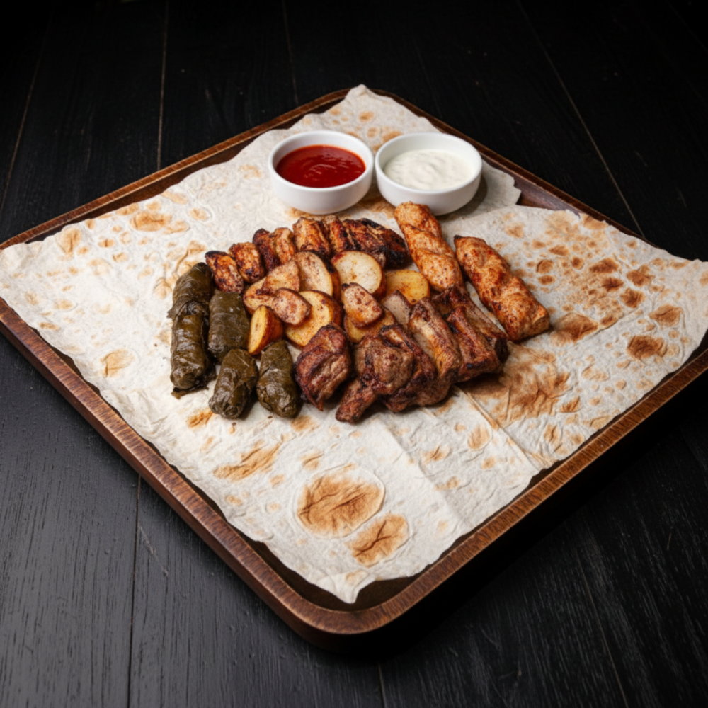 Рёбра, люля кур., крылья, долма, картошка с салом соус белый-2 соус красный-1 тар-тар-1 капуста,лук-2 лаваш-3 куска Сеты не проходят по акциям и промо-кодам. Баллы с сетов не списываются